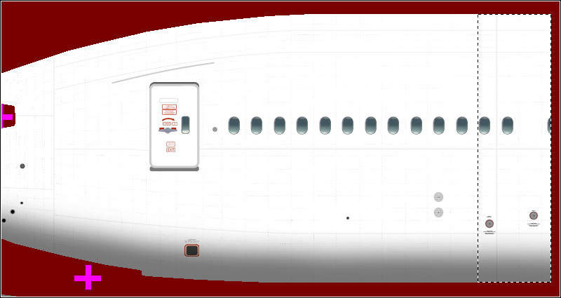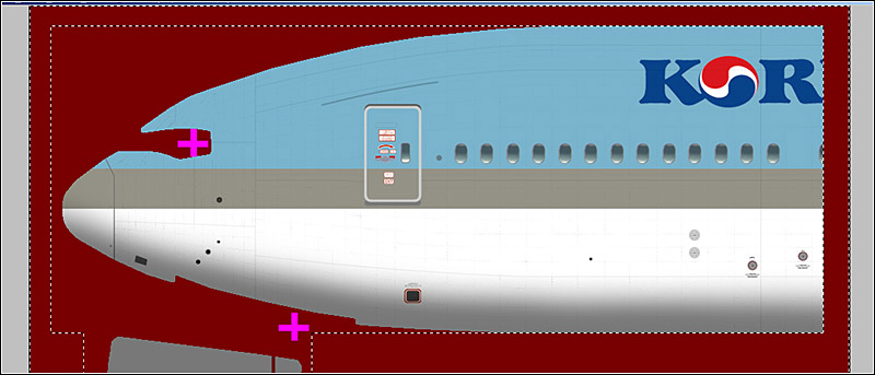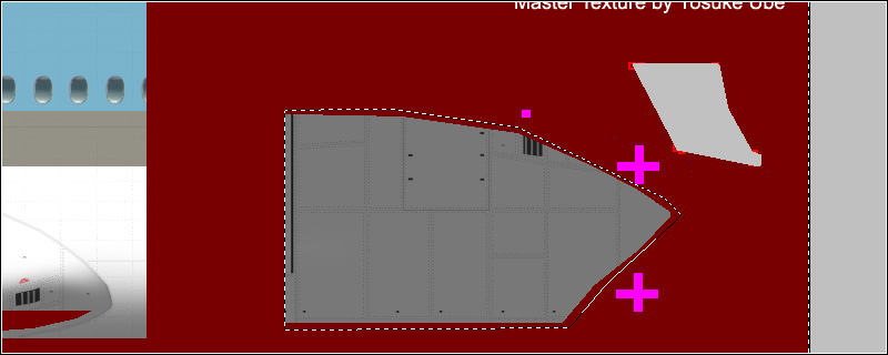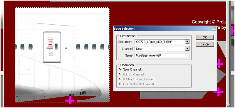 Use the Rectangular Marquee Tool in combination with the Transform Selection function to select the lower-left part of the fuselage. Inverse the selection, save it and name it "Fuselage lower-left".