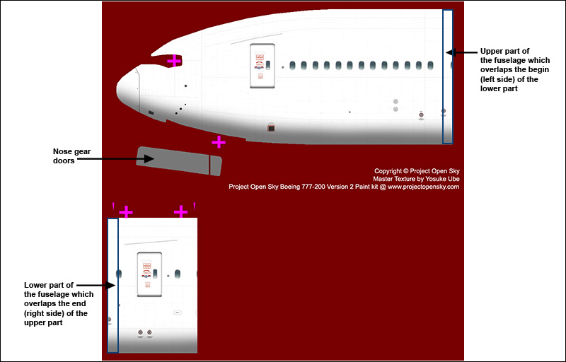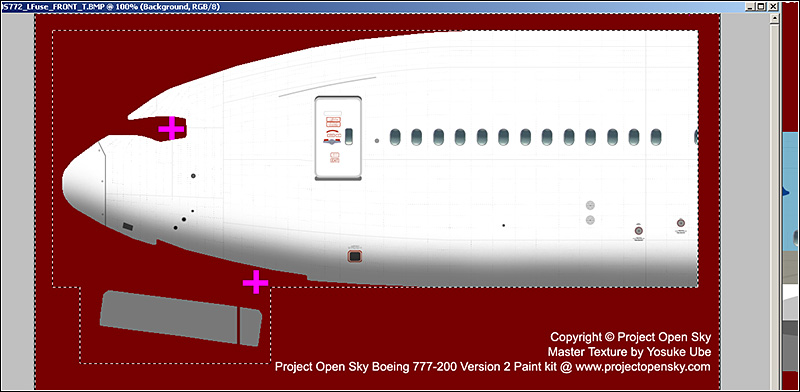 Now that the aircraft has been installed, lets get back to the paintkit in Photoshop. You need to add the painted parts to the 3 texture files that make up the left side of the fuselage, including the tail. First, click on "Select" in the menu on top and then on "All". Now go to the menu on top again and click on "Edit" and then on "Copy Merged". With these few commands you have selected the entire paintkit and copied it to the clipboard as a flat (= without layers) image. Next thing is to open the first texture file. Go to the top menu and click on "File" and then on "Open". Browse to the paintkit folder and open the "fuselage" folder and then the "White layout" folder. You should see a file called "OS772_LFuse_FRONT_T.BMP". Open the file.
