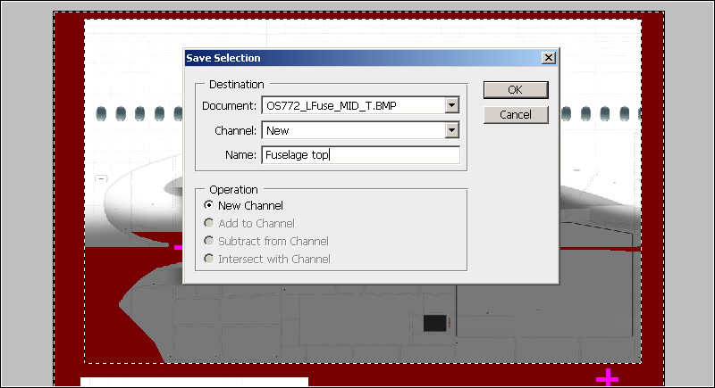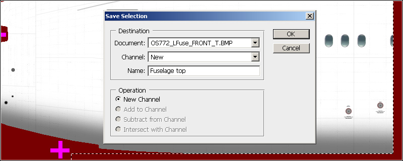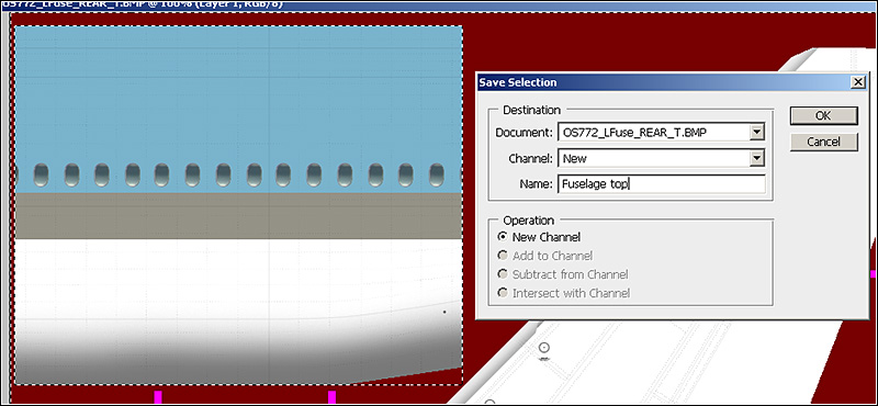 Use the Rectangular Marquee Tool in combination with the Transform Selection function to select the upper part of the fuselage, including the belly of the aircraft. Inverse the selection, save it and name it "Fuselage top".