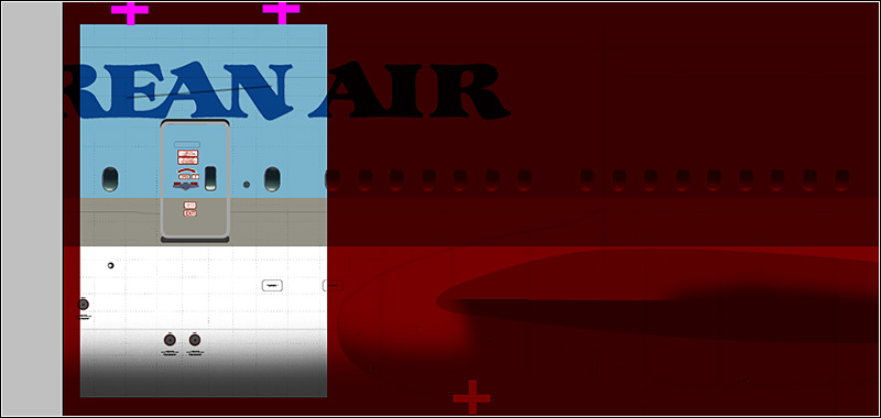 Now you see the forward part of the white fuselage. Go to the menu on top and choose "Edit" and then "Paste". If you have done everything right, the painted fuselage from the paintkit has been added to the image as a new layer. Now go to the layers window and make sure that the new layer is selected (which should be "Layer 1"). Now there is a dropdown menu just above the selected layer that should say "Normal". Click on it and select "Multiply". The layer should become transparant, so you can see the background through it. Left-click in the image and hold the left mouse button while you move the mouse to align the fuselage of the new layer with the white fuselage in the background. For that, you can use the magenta colored crosses, which are meant for alignment. You can use the Zoom Tool to zoom in on the image so you can be more precise. Note that the top part of the fuselage should be aligned, you will take care of the smaller lower part in a moment. To make this easier, you can enable snapping. On the menu on top, click on "View" and then on "Snap".