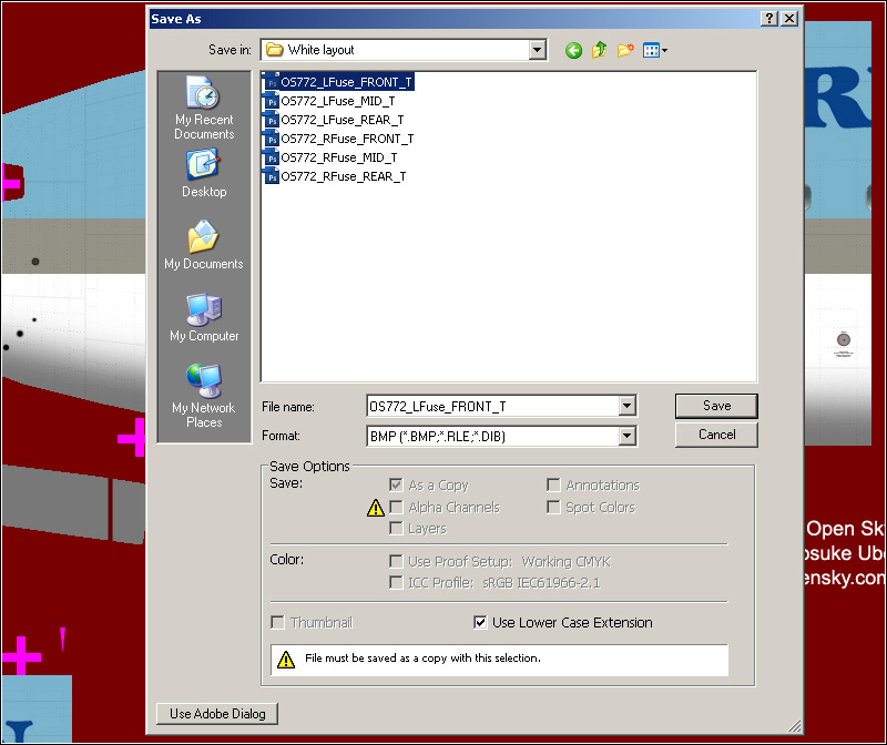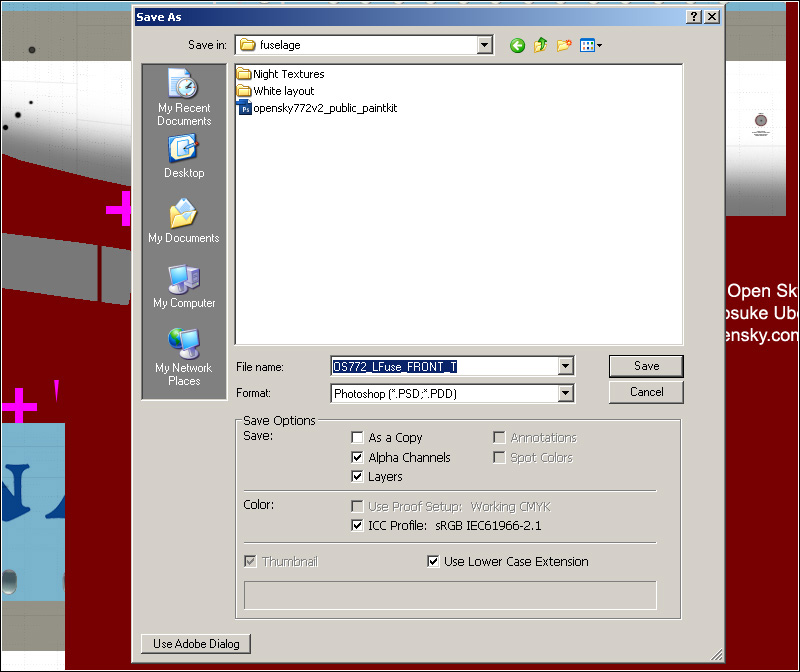 Now keep this window open, you need to save this file, so you can just load the selection next time. Go to the menu on top and click on "File" and then on "Save As...". The save window will appear now. Make sure that you save in Photoshop format (which will keep your saved selections) and save the file in the folder "fuselage". See the screenshot below.
