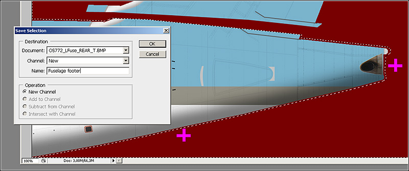 Go to the menu on top and click on "Select" and then on "Inverse". Click on "Select" again and click on "Save Selection...". Name it "Fuselage footer" and click on "OK". Now this selection has been saved as well. Go back to the layer window, select "Layer 2" and make it visible again. Hit the delete key so only the lower part of the fuselage remains. Deselect.