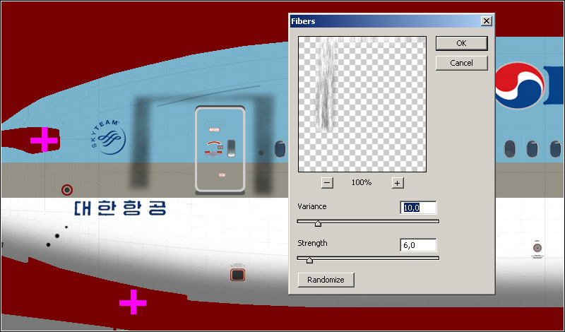 Time to make the rear fuselage dirty. Select "Layer 27" in the layer group "left detail". Use the Magic Wand Tool to select the dots and then inverse the selection. Create a new layer and name it "APU dirt left". Expand the selection by 1 pixel. Feather the selection by 1 pixels. Render clouds and then render fibers with a variance of 38,0 and strength of 1,0. Deselect and set the blending mode to "Multiply". Set the opacity to 20 %.