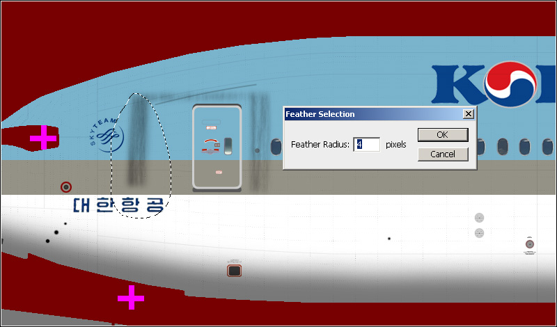There are many ways to create dirt effects in Photoshop. I will show you a few that can be used for this paint. Start with the dirt around the passenger doors, caused by the jetways. Create a new layer and put it above the layer group "Effect". Use the Polygonal Lasso Tool to select something like this around the door:
