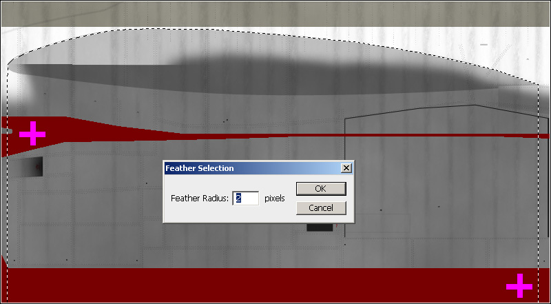 Now you are going to add some dirt to the belly of the aircraft. Select the layer "Layer 15", which is inside the layer group "left fairing". Use the Magic Wand Tool to select the lines and then inverse the selection. Create a new layer and name it "Belly dirt left". Expand the selection by 2 pixels (Select > Modify > Expand...). Then, feather the selection by 4 pixels (Select > Modify > Feather...).