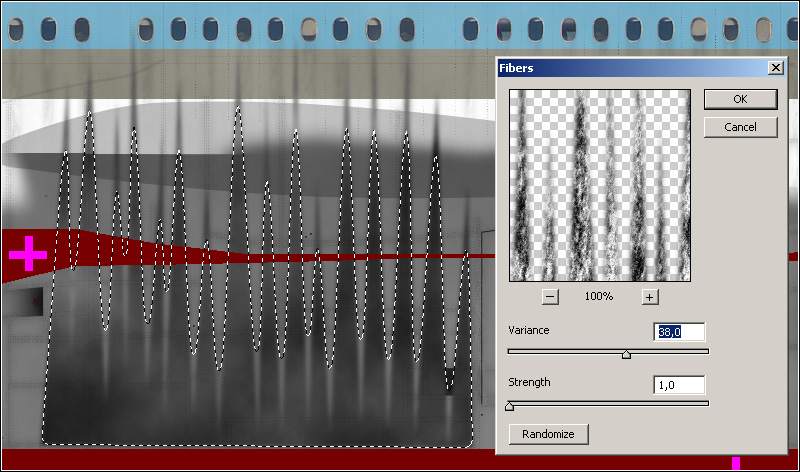 Change the blending mode of this layer to "Overlay" and the opacity to 25%. Create another new layer, while you still keep the selection. Name this layer "fusedirt 2" Now create clouds again and after that click again on "Filter" then on "Render", but this time on "Fibers...". Choose a variance of 15,0 and a strength of 1,0. Change the blending mode of this layer to "Multiply" and the opacity to 5%. You can deselect now.