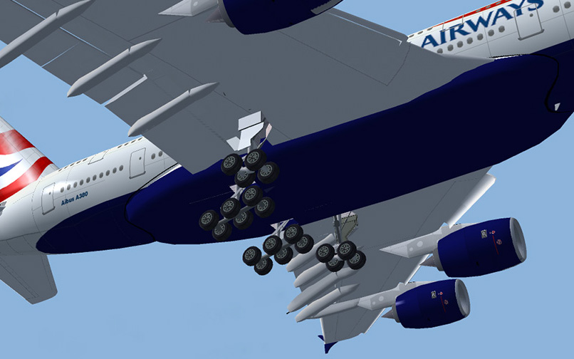 This Airbus A380 is for sure not a very detailed aircraft, but at least it is freeware. The flight dynamics are quite easy, although the fuel/payload model is not right. The main landing gear angle is not right and all 4 engines are equipped with thrust reversers (should be only the two inboard engines). The textures lack in detail and there aren't many repaints at all.