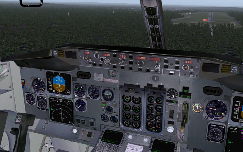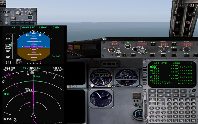 The 2d panel looks exactly like the real classic Boeing 737 cockpit. Many systems are modeled, like TCAS, GPWS, Weather Radar, CDU and even the auto land function. The two EFIS screens (EADI and EHSI) can be expanded by clicking on them, which also works in the virtual cockpit. With the small icons on the top-left corner of the screen, you can bring up the pedestal, radio panel, overhead, cdu, flaps panel, IRS panel, etc.