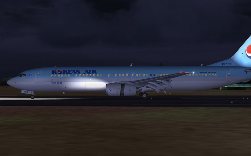Like all aircraft in the Fly into the sky! package, this Boeing 737-900 is a beautifully designed aircraft and represents its real world counterpart well. The package contains only one Boeing 737-900 livery: Korean Air. The 2d panel is frame rate friendly, but doesn't have a FMC. For full IFR flights, you need to use the default Carmin GPS unit. ILS Approaches are no problem, just enter the course/ILS frequency and use the LOC and APPR buttons. The virtual cockpit is a bit simple, only the most important systems are modeled. But it looks nice and is frame rate friendly too. There is also a wingview model for even better frame rate.