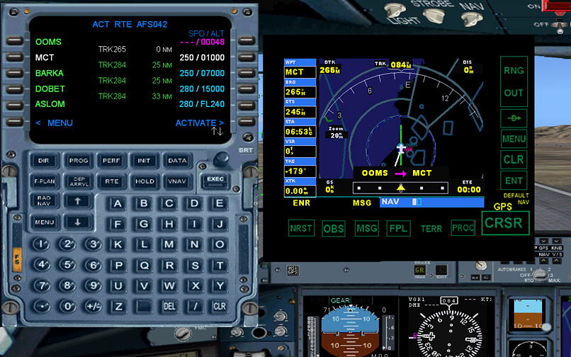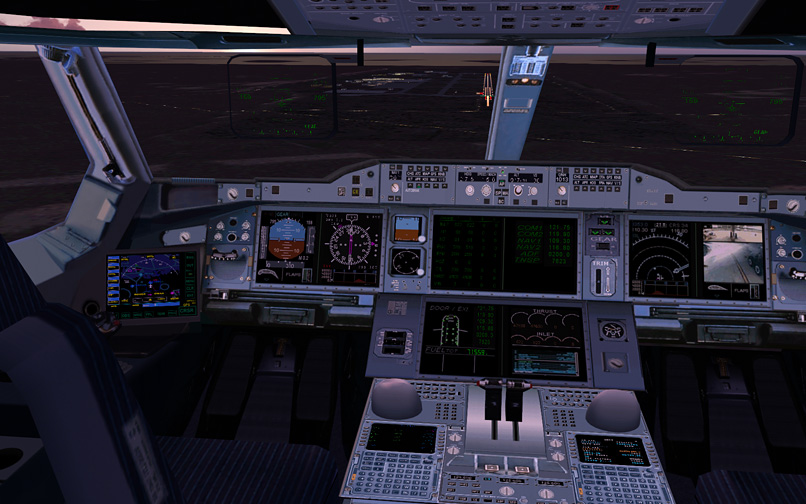 The panel is simple, many default gauges are used and the garmin gps is integrated into the panel. A simple FMC can be used in autoflight and it automatically imports the fs flightplan. The virtual cockpit is very simple with only a few animations. For example, the rudder pedals aren't moving. The vc textures are not very good either.