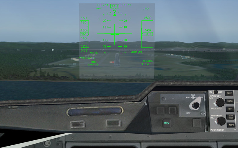 If you like to control the aircraft in the virtual cockpit, you'll be pleased. The VC looks very realistic and most of the buttons and handles are clickable. Many animations are visible, like a moving nose wheel steering, opening windows, moving windshield wipers and even the manual braking is visible on the rudder pedals! With a click on a button, you can switch on the HUD (Head Up Display) function (see screenshot #3), which can be useful during approach.