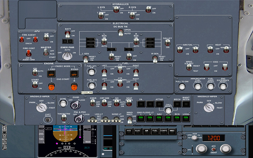Flying this 717 is not that difficult, the flight dynamics seem to be accurate. A 124 pages PDF manual explains how to operate the aircraft. The aircraft is equipped with build in scenery like a fuel truck, baggage carts, ground power, ect. All those objects can be activated with a sub-panel which can also be used to open doors.