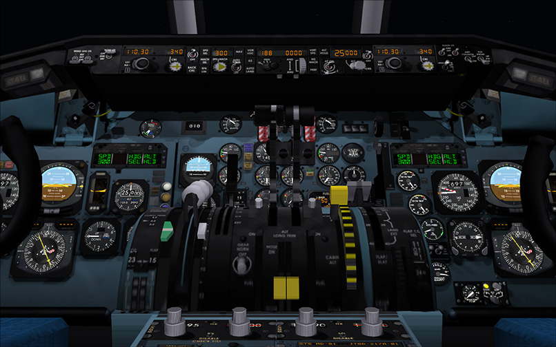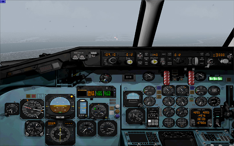 If you don't like to learn all the systems at first, you can choose one of the start modes, like 'cleared for takeoff' which configures the aircraft automatically for you up to the takeoff flap setting. Advanced instruments and functions like the flight computers, weather radar and autoland feature are all simulated. Buttons and knobs that are clickable on the panel are clickable in the virtual cockpit as well. So you can do an entire flight from within the vc. Interesting detail: the windows on the fuselage are not textures, but you can see right through the aircraft and see the interior. It looks more realistic compared to flat textures.
