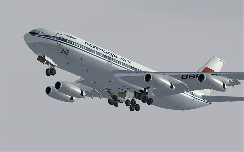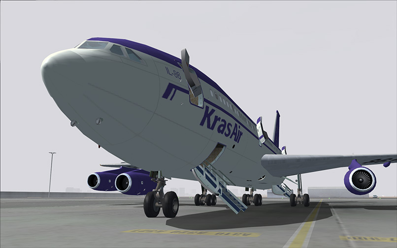 The Samdim Design Group is developer of various Russian aircraft for FS2004 and FSX. Their Ilyushin Il-86 is a freeware product, compatible with FS2004 and FSX. The exterior looks good and is very frame rate friendly. Everything works well and all the usual animations are present. The 2d panel is very simple and build with a few FS2004 default gauges. The main landing gear looks nice, but the animation is not right. The wheels are sinking a bit into the ground on takeoff and landing. Also, the suspension is unrealistic, the wheels are going up and down, but the fuselage stays level. Interesting detail: the brake disks color red on roll out after landing.