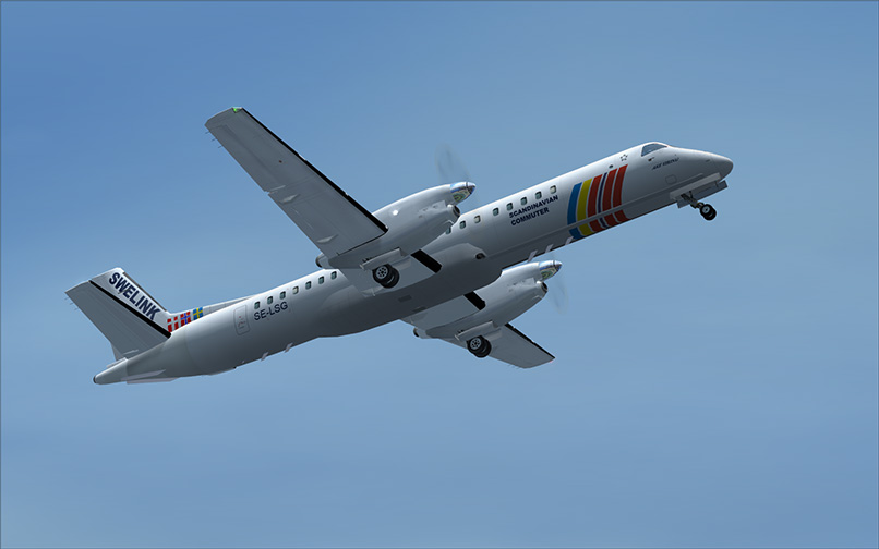 Blu Sky Mine Productions is a freeware developer of various turboprop aircraft for FS2004. Their Saab 2000 is a nice model with average quality liveries. The package contains a few liveries, panel and engine sounds. All animations seem to be accurate although the main landing gear is floating a bit on takeoff/landing. Some special animations are moving pilot heads, pushback truck and maintenance mode (see screenshot 1). The panel looks nice, but the functionality is limited. Only a few systems are simulated and the weather radar is actually not working, just a moving picture. An interesting bug is the pushback truck to appears to be stuck to the aircraft in the virtual cockpit mode. Only the "wingview" model seem to have that problem.