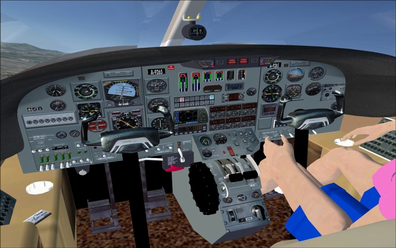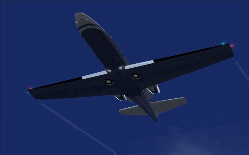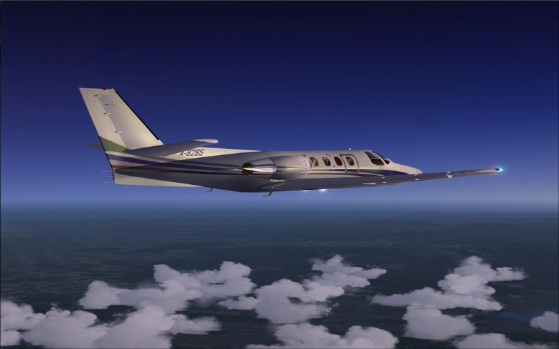 Alejandro Rojas developed this simple Citation 500 add-on for both FS9 and FSX. The exterior is very simple as well as the panel and the virtual cockpit. A passenger cabin is also modeled in the virtual cockpit and wings can be seen through the windows in the cabin. An animated (female) first officer sits next to you in the vc. You can choose between a light and full vc model, although that seems not necessary since the model is already very frame rate friendly.