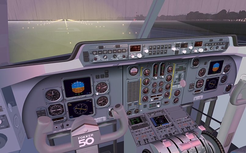 Precisionaerobus (PAOB) is developer of payware aircraft for FS2004 and FSX. However, their Fokker 50 is for FS2004 only. The package includes the F50 model with 5 liveries (KLM, VLM, SonAir, MASwing and VLM-Aanvalluh), 2d panel, virtual cockpit and sounds. The exterior is quite detailed and so are the liveries. Many (but not all) cockpit systems are simulated, like air conditioning, anti-ice, APU, electrical, fuel, hydraulics, etc. You can access those systems via the 2d panel or in the virtual cockpit. The panel looks realistic, many buttons ands knobs are clickable. The vc isn't bad either, although the lack of photorealistic textures makes it look a bit cartoonish. A passenger cabin is also modeled in the vc. Unfortunately, the wings are not modeled in the vc which means no wingview.