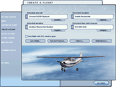 If you want to fly more seriously, there are various lessons available in the 'Flying Lessons' section. It is also possible to 'Select a flight'. Select 'Create a flight' if you want to choose a start location, aircraft type, weather and time by yourself.