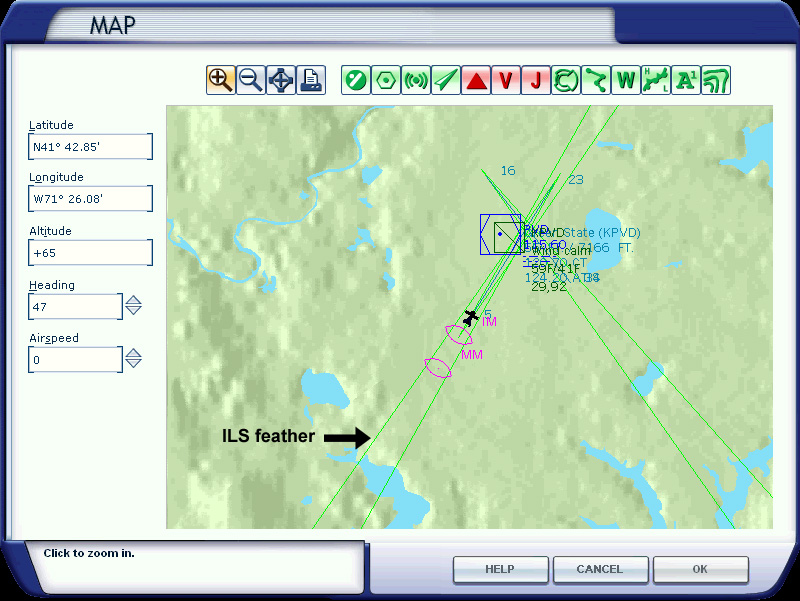 The screenshot above shows you the map of Green State Airport (KPVD) in FSX. The map in FS2004 is very similar. Double click on the green feather to see the facility information.