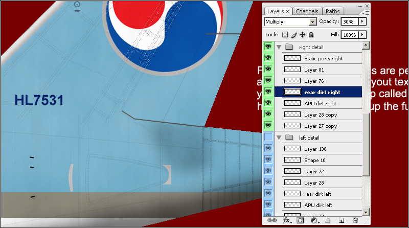 Go to the Filters and "Sharpen More" this layer. Then, change the blending mode to "Multiply" and set the opacity to 50%, or anything you like. Use the same method for the right side, or just duplicate this layer for the right side. With this method, you can also add dirt to the gear bay doors. I ended up with this: