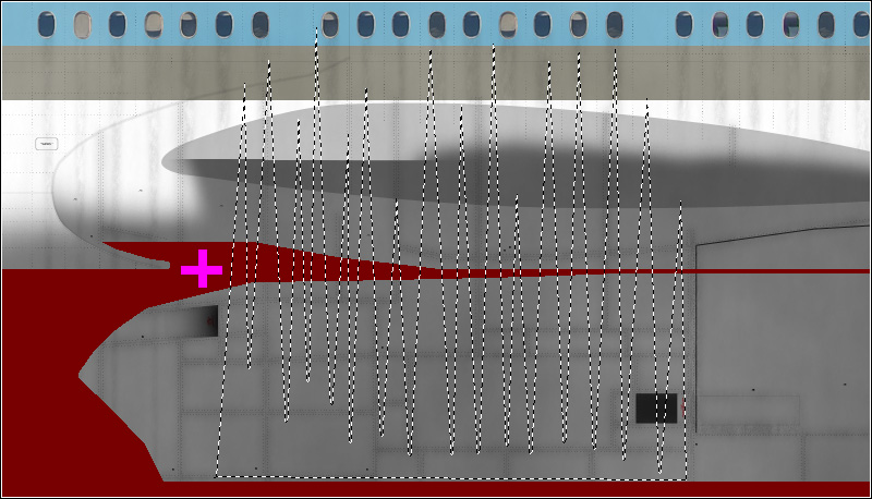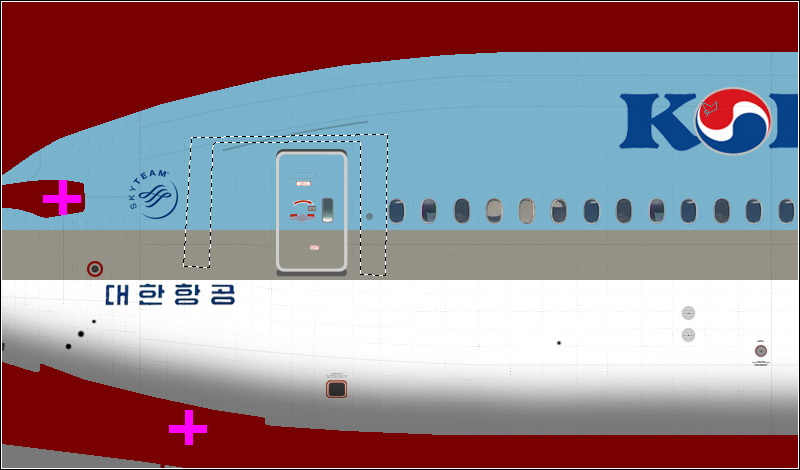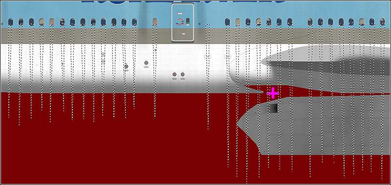 There are many ways to create dirt effects in Photoshop. I will show you a few that can be used for this paint. Start with the dirt around the passenger doors, caused by the jetways. Create a new layer and put it above the layer group "Effect". Use the Polygonal Lasso Tool to select something like this around the door: