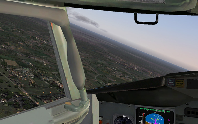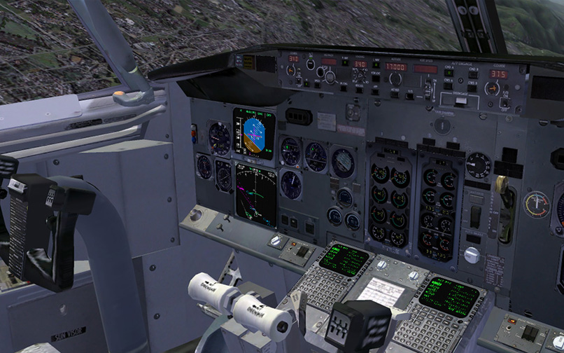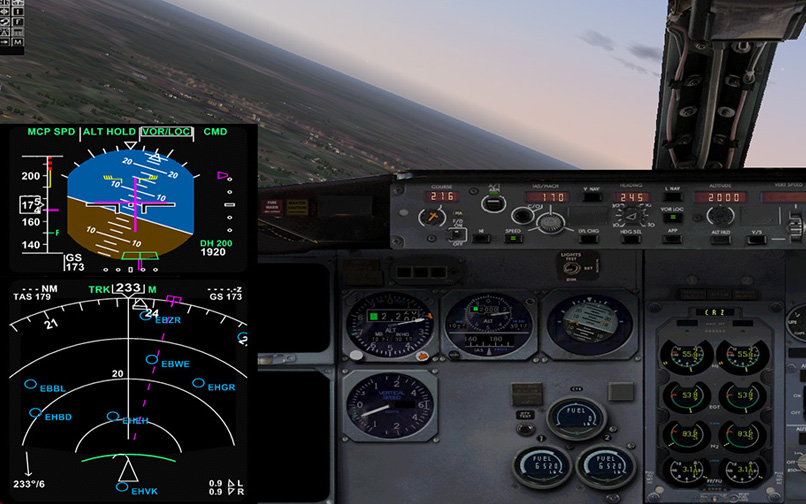 The 2d panel looks exactly like the real classic Boeing 737 cockpit. Many systems are modeled, like TCAS, GPWS, Weather Radar, CDU and even the auto land function. The two EFIS screens (EADI and EHSI) can be expanded by clicking on them, which also works in the virtual cockpit. With the small icons on the top-left corner of the screen, you can bring up the pedestal, radio panel, overhead, cdu, flaps panel, IRS panel, etc.