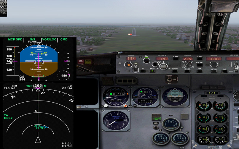 The 2d panel looks exactly like the real classic Boeing 737 cockpit. Many systems are modeled, like TCAS, GPWS, Weather Radar, CDU and even the auto land function. The two EFIS screens (EADI and EHSI) can be expanded by clicking on them, which also works in the virtual cockpit. With the small icons on the top-left corner of the screen, you can bring up the pedestal, radio panel, overhead, cdu, flaps panel, IRS panel, etc.