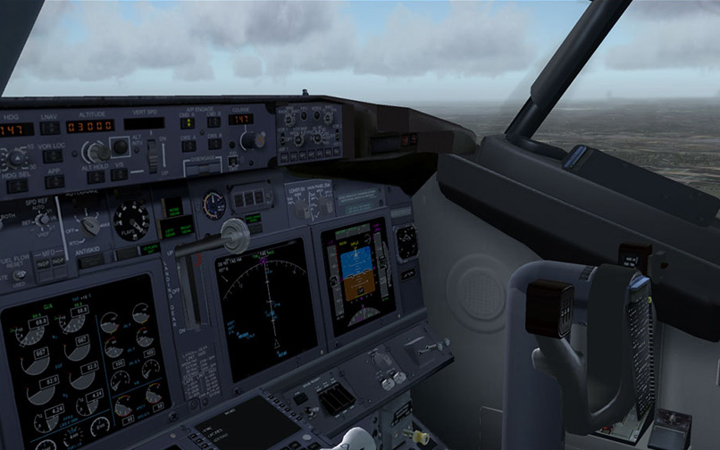 The 2d panel is well designed and looks quite real. The virtual cockpit is fully functional, all buttons are clickable and all displays are functional. In addition to the virtual cockpit, there is even a virtual passenger cabin modeled! In the interest of frame rate, there are 3 different models to choose from: wingview model, virtual cockpit model and virtual cockpit + virtual cabin model. All the usual animations are present and a few special animations like moving window wipers and animated airstairs.