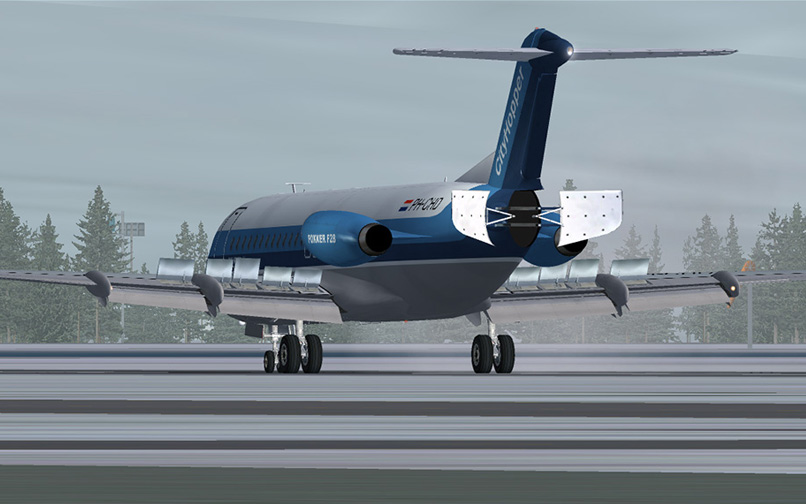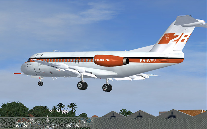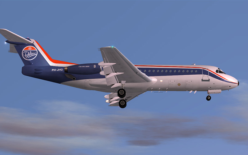 Project Fokker Jetline is a Fokker-only freeware developer. Their F28 package contains two F28 models (F28-1000 and F28-4000), panel, sound package, 3 F28-1000 liveries and 3 F28-4000 liveries. The exterior model as well as the liveries are great and all animations seem to be accurate. Although only the most important systems are modeled, the panel looks realistic and works fine. The flight dynamics seem to be realistic and the autopilot is working perfectly. Both the inside and outside engine sounds resemble the classic Rolls-Royce engines very well.