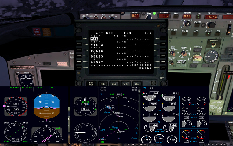 Flying the aircraft entirely in the virtual cockpit is no problem, all common levers and switches are clickable and animated and the EFIS displays will popup in a separate window when clicked. Sometimes, the text near the levers and switches is a bit hard to read. Good thing that there are tooltips (pop-up text) activated for every system. The lighting of the virtual cockpit can be adjusted by lighting levels on the panel, just like the real thing. The CDU is fully functional with VNAV profiles, SID\STAR support, waypoint ALT and SPD restrictions, smooth curved flight path on vector display, etc.