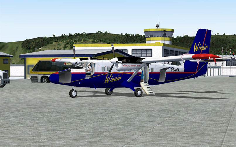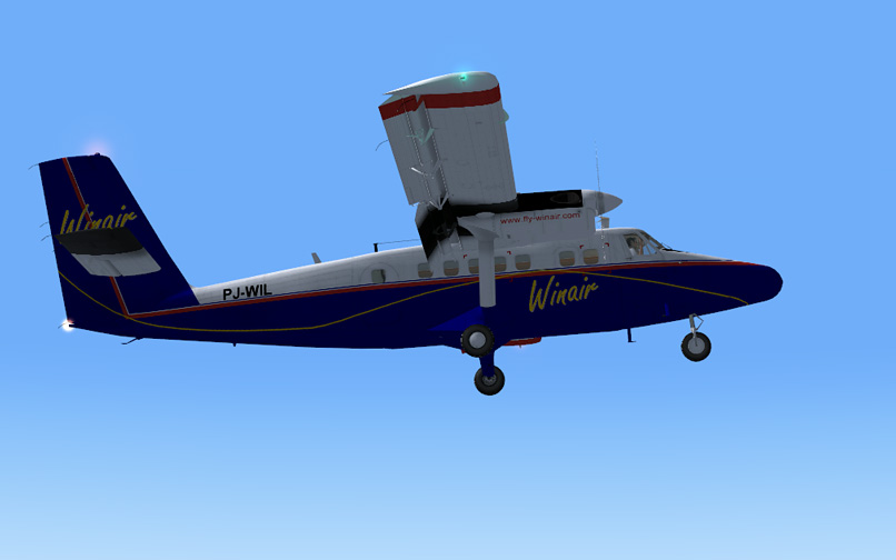 Like their other products, Aerosim's Prop-Liners Collections package can be considered 'light' payware, because their aircraft doesn't have advanced systems programming. Their Twin Otter is a frame rate friendly model that looks very good actually. Only three liveries are included: Aeropelican, Malaysia and Winair. The panel and the virtual cockpit is simple. All the basic functions are present, but expect nothing more. The textures in the virtual cockpit are low resolution and look a bit blurry, especially on high resolution monitors. Also, only a few handles and switches are clickable.
