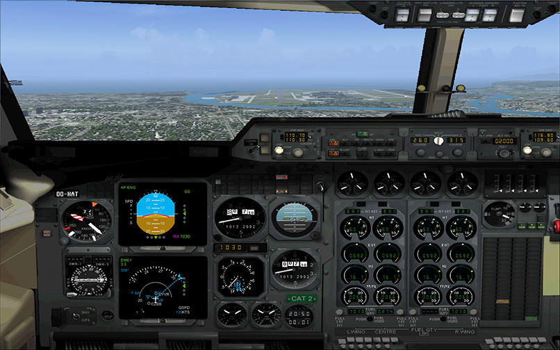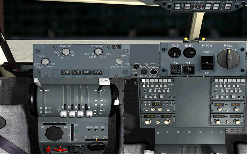 The exterior looks great, many details and realistic (behavior of the) landing gear. The liveries are ok, some of them could be better. The textures however, are great with many dirt effects on various parts of the aircraft. The 2d panel looks good, many systems are simulated and many buttons and knobs are clickable. There is no virtual cockpit and neither are there wingviews. Let's keep in mind that these aircraft are originally developed for FS2002, a virtual cockpit wasn't common in those days. Some parts of the panel like the EFIS screens show a larger version when clicked on. This is also the case with the warning lights, but those are of such a low resolution, you can't read them. There is also a pushback panel which allows you to control the animated pushback tug, air stairs and doors. The window wiper switches on the overhead panel are nice, but why are there no wipers moving on the exterior?