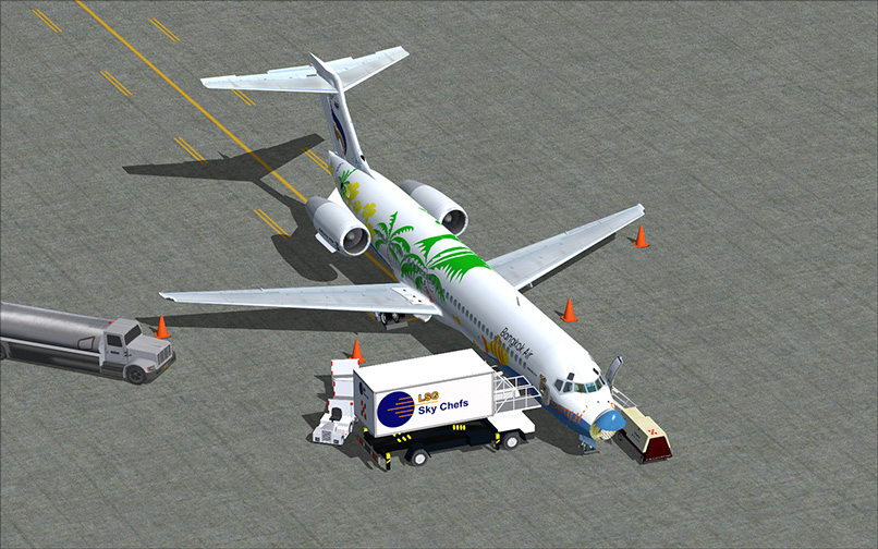 Flying this 717 is not that difficult, the flight dynamics seem to be accurate. A 124 pages PDF manual explains how to operate the aircraft. The aircraft is equipped with build in scenery like a fuel truck, baggage carts, ground power, ect. All those objects can be activated with a sub-panel which can also be used to open doors.