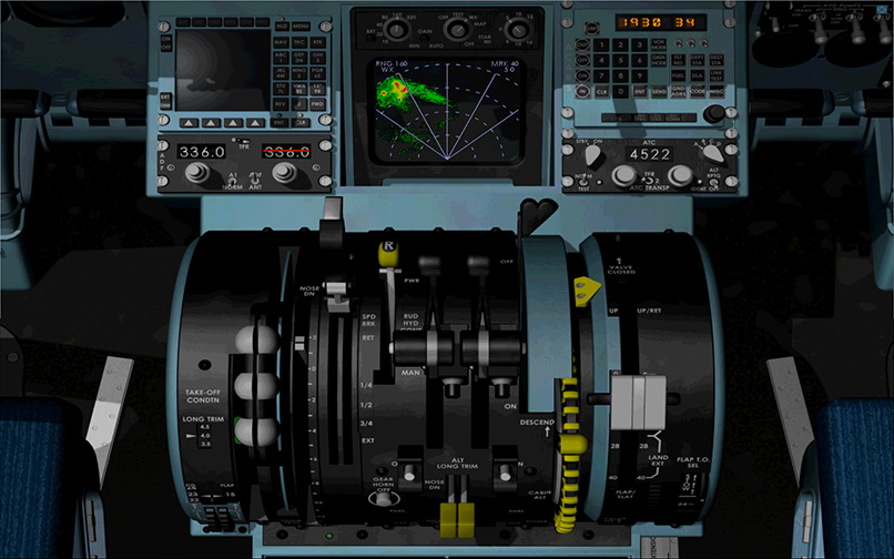 If you don't like to learn all the systems at first, you can choose one of the start modes, like 'cleared for takeoff' which configures the aircraft automatically for you up to the takeoff flap setting. Advanced instruments and functions like the flight computers, weather radar and autoland feature are all simulated. Buttons and knobs that are clickable on the panel are clickable in the virtual cockpit as well. So you can do an entire flight from within the vc. Interesting detail: the windows on the fuselage are not textures, but you can see right through the aircraft and see the interior. It looks more realistic compared to flat textures.