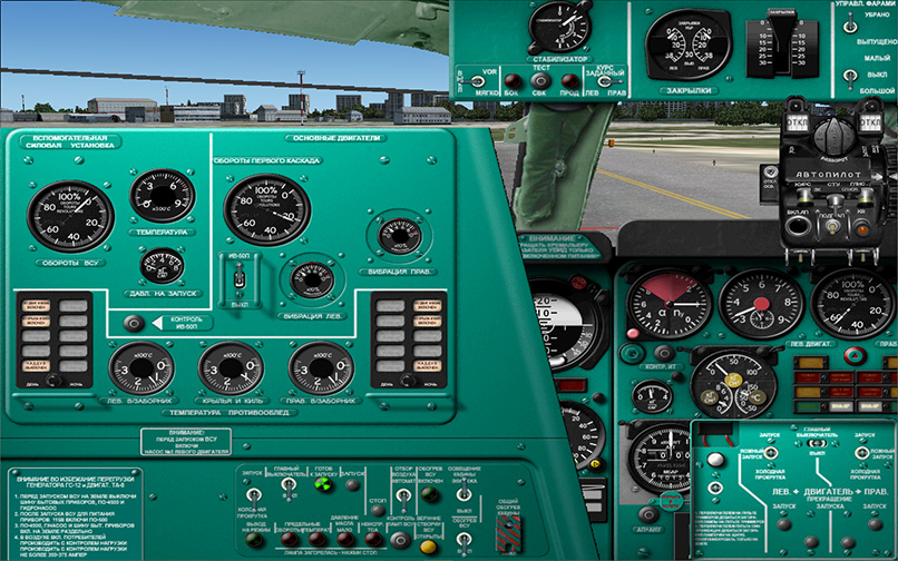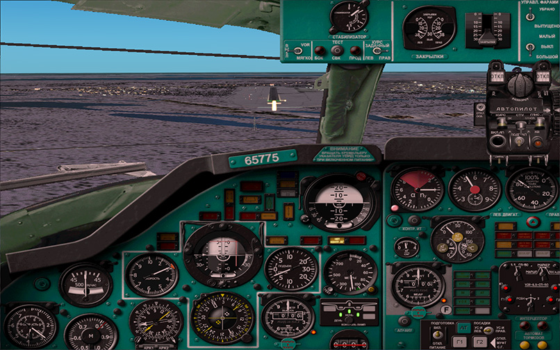 Soviet Classics Simulation (SCS) developed a nice and complex freeware Tu-134A. The package comes with an easy to use installer and includes two liveries: Aeroflot and Perm Airlines. The exterior looks good and all the usual animations are present. The panel is quite complex with many simulated systems, accessible via several sub-panels. The default start up mode is cold & dark, which means that the aircraft is completely shut down. Unfortunately, there is no manual included, so it's not easy to start up all the systems. There is however a short engine start manual available (see the download locations for the link) which also includes a switch overview. That overview is quite handy since all the buttons and switches have Russian text on them and there aren't any English popup tooltips either. Unlike the Project Tupolev Tu-154M, you can save your flight with all systems on and then load it the next time, so you don't have to go through the start up procedure again.