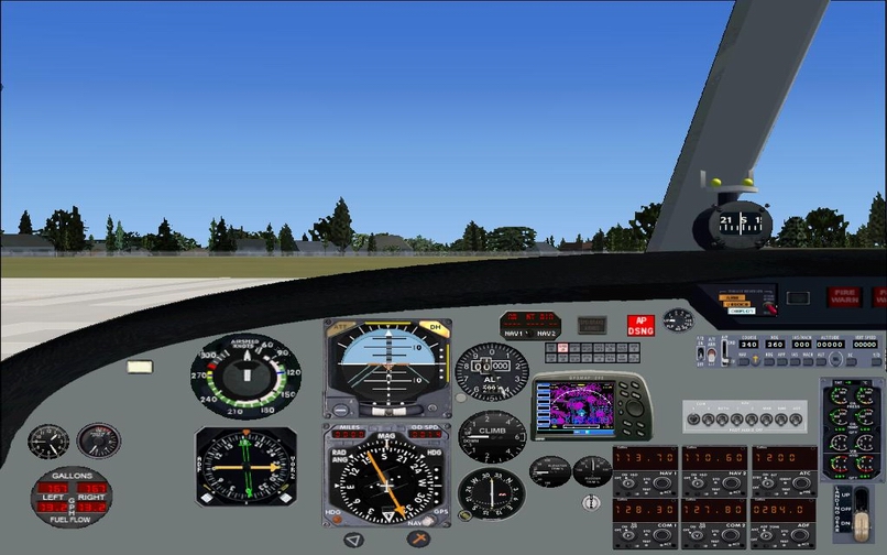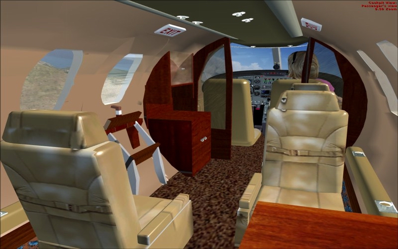 Alejandro Rojas developed this simple Citation 500 add-on for both FS9 and FSX. The exterior is very simple as well as the panel and the virtual cockpit. A passenger cabin is also modeled in the virtual cockpit and wings can be seen through the windows in the cabin. An animated (female) first officer sits next to you in the vc. You can choose between a light and full vc model, although that seems not necessary since the model is already very frame rate friendly.