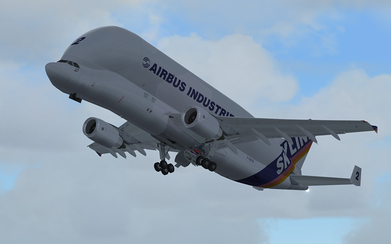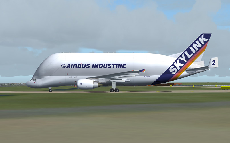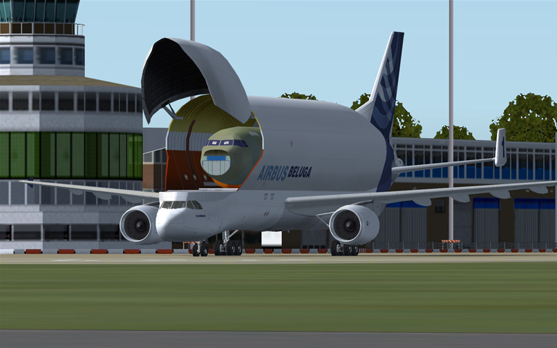 This Airbus A300 package contains the A300B4-608ST Super Transporter, also known as the "Beluga". The package contains 4 different liveries: The Airbus No.1 2006 (new house colors), the Airbus No.2 2004 (old house colors, "Skylink"), the Airbus No.3 (old house colors "The Super Transporter" titles) and the UPS livery. The exterior is highly detailed and features dynamic shine, dynamic wingflex, opening doors and pushback truck. The big cargo door above the cockpit can be opened, with A320 fuselage visible in it. The interior is a less detailed virtual cockpit and wingview. The virtual cockpit looks nice, but not all systems are modelled, so not all buttons and switches are clickable.