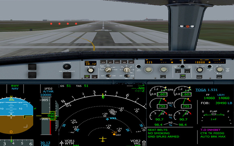 Almost all systems are modeled, accessible from the 2d panel and also from the virtual cockpit (all buttons and handles are clickable). Both the 2d panel and virtual cockpit looks very realistic and the displays are clear and bright. The FMGC (Flight Management and Guidance Computer) is completely modeled, something I haven't seen often in payware packages. Also systems like TCAS and GPWS are modeled, as well as all the systems located on the overhead panel. Even the autoland function works like the real thing, which I haven't seen in many payware packages either. Typical Airbus fly-by-wire systems are also realistically modeled. A weather radar however, is not present.